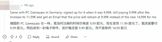 邮件发出后,许多用户在 Reddit 上确认收到了同样的信息。一位用户表示:“在德国PC Game Pass也是这样,我当时是9.99欧元订阅的,涨到11.99欧元后我仍然只付9.99欧元,而且我收到的邮件确认价格会维持9.99欧元,而不是新的14.99欧元。”