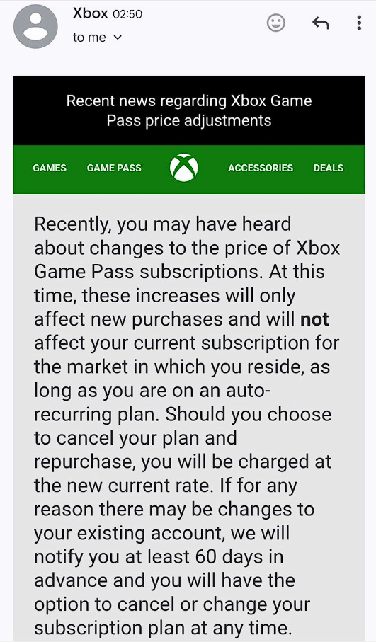 邮件中写道:“最近你可能听说过Xbox Game Pass订阅价格的变化。目前,这些涨价仅适用于新购买的用户,不会影响你所在地区的现有订阅,只要你保持自动续订计划。如果你选择取消并重新购买谷锦网,将会按照最新的价格收费。如果因任何原因需要调整你当前的账户,我们会至少提前60天通知,你将可以选择取消或更改订阅计划。”