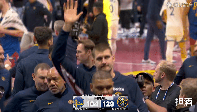 比赛结束,约基奇从替补席起身,没有停留,直接走向球员通道,还一边向着球迷挥手致意,看起来心情很不错。