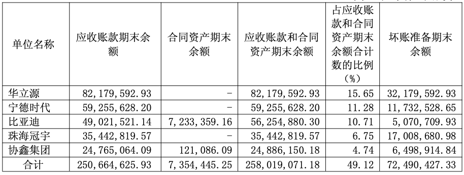 根据瀚川智能年报披露的“按欠款方归集的期末余额前五名的应收账款和合同资产情况”一项中,华立源、宁德时代、比亚迪、珠海冠宇、协鑫集团为相关额度前五名的欠款方。