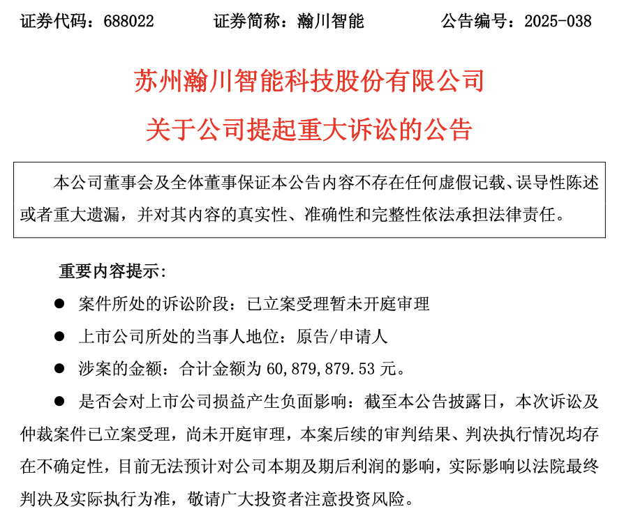 5月23日,瀚川智能(688022.SH)发布公司提起重大诉讼公告,其对宁德时代及两家子公司因未按合同付款提起诉讼,涉案金额约6087.99万元。